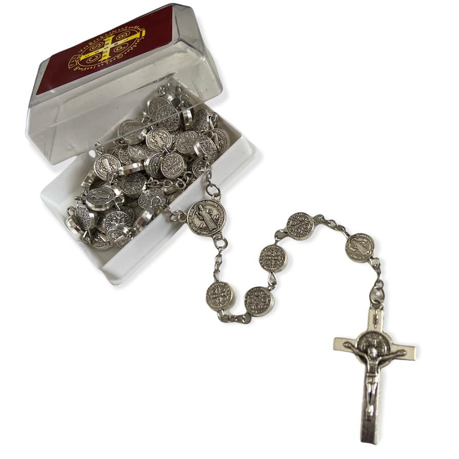 Terço De São Bento Medalhas Prateada com Caixa 60cm